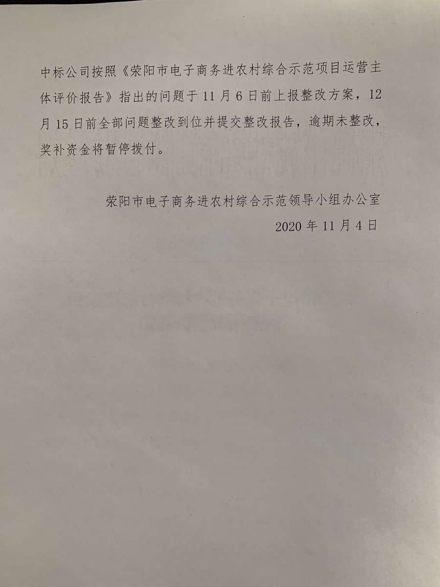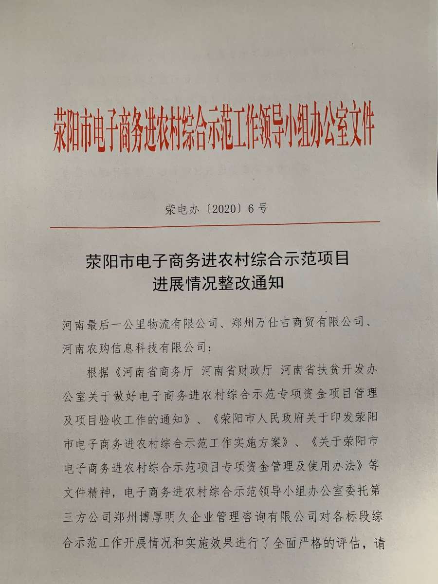 荥阳市电子商务进农村综合示范项目进展情况整改通知